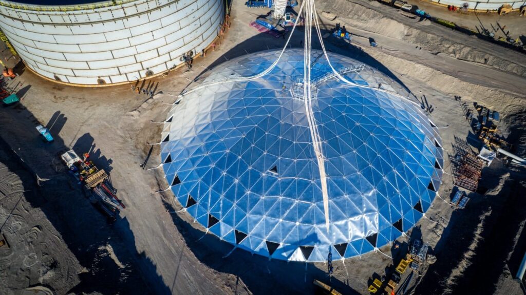 La instalación del domo geodésico de aluminio sobre uno de los tanques de la estación de bombeo de Allen marca un nuevo avance en la ejecución del proyecto Vaca Muerta Oil Sur (VMOS), una de las obras de infraestructura energética más importantes del país.