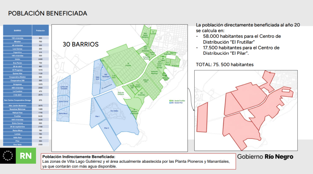 La obra consiste en el nuevo sistema de abastecimiento de agua potable para la zona sur de Bariloche, mediante una captación en Lago Gutiérrez. Se trata de un proyecto estratégico que dará respuesta a una demanda estructural: al finalizar su período de diseño, en 2046, beneficiará directamente a 75.500 habitantes que residen en los barrios ubicados al sur del Cerro Otto.
