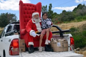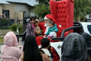 La aventura continuó con una parada muy especial en el Barrio La Habana. Cerca de las 11:40 horas, la Plaza del Barrio 270 Viviendas se convirtió en el epicentro de la ternura, recibiendo a una multitud de niños y niñas que, con cartitas en mano y ojos brillantes de expectativa, esperaron pacientemente su turno para estrechar la mano de Papá Noel.