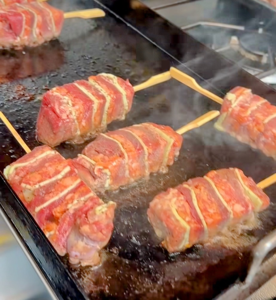 Posteriormente enrollada de forma bilateral junto con sus lomos en el centro y luego insertada en un pincho de bambu y el Kebab de Lomo, una versión propia de un producto distintivo de la gastronomía de medio oriente. Esta receta lleva un minucioso armado, y es la suma de láminas de lomo combinadas con queso al pesto, aportando color y cremosidad, esta mezcla de embutidos caseros que añade un contraste irresistible de textura y sabor y láminas de tocino, para preservar la jugosidad.
