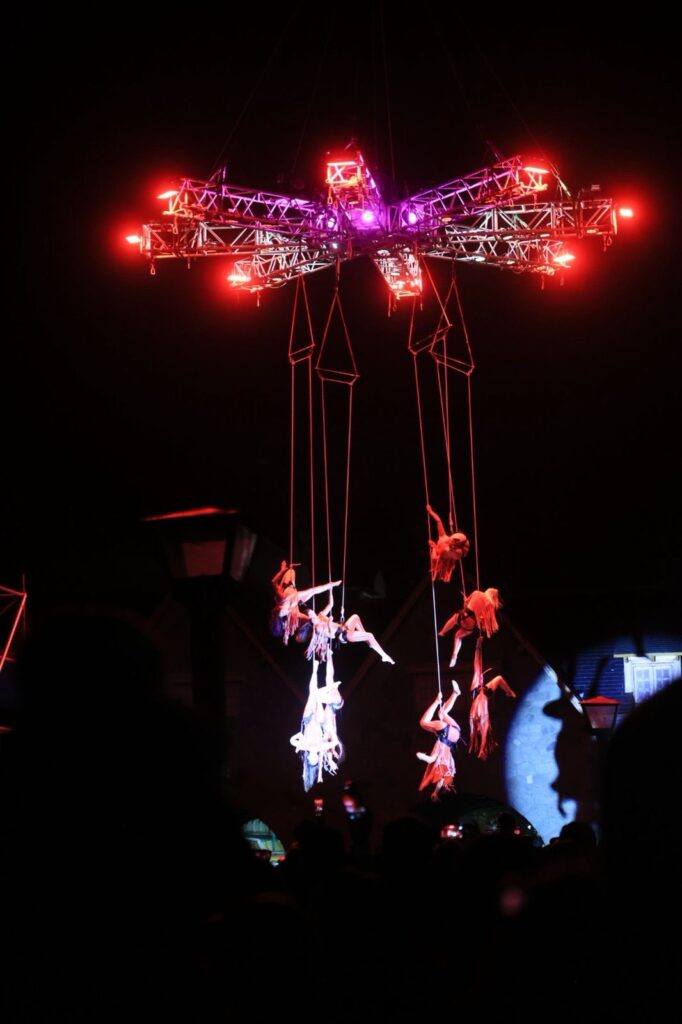 Suspendidos a gran altura, los bailarines ofrecieron un espectáculo de altísima calidad artística, con coreografías que sorprendieron por su precisión y belleza. La iluminación y los efectos visuales acompañaron cada momento, creando una experiencia inmersiva que cautivó a las miles de personas que colmaron el Centro Cívico.