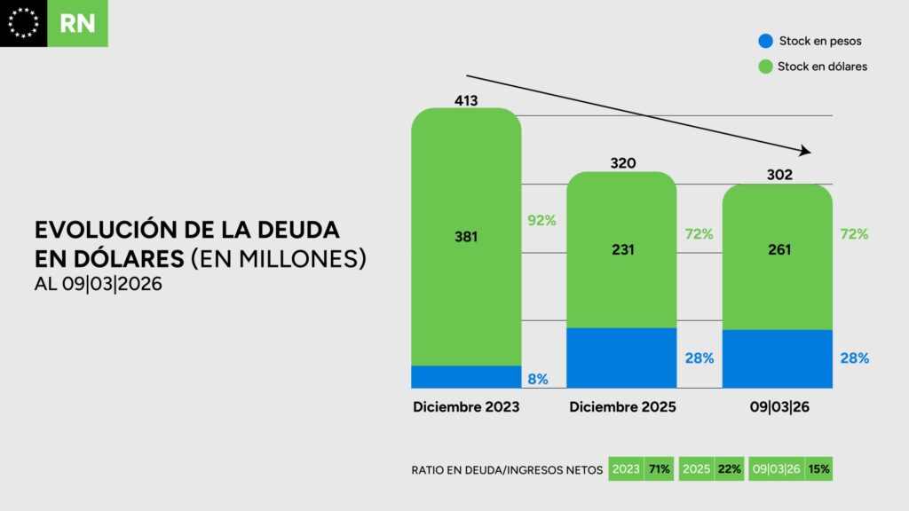 Entre diciembre de 2023 y marzo de 2026, Río Negro redujo su deuda total en dólares de U$S 413 millones a U$S 302 millones, es decir, U$S 111 millones menos (-27%). En paralelo, el peso de la deuda sobre los ingresos corrientes cayó del 71% al 15%, lo que representa una mejora histórica del 79% en los indicadores de sostenibilidad fiscal.