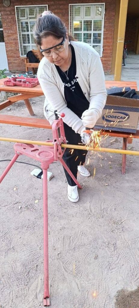 Alumnos aprendiendo el uso de herramientas: terrajas manual para hacer rosca y roscadora eléctrica. Todo desarrollado en el Centro Municipal de Formación y Oficios